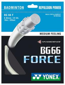 Yonex BG66 Force White is a thin gauge (0.65m) string for players serious about hitting power. The solid feel from the nylon composite coating gives extra power with top control. Would suit a consistent hitting singles player .Constructed with a high-intensity nylon core which gives 30% greater durability than normal nylon. The nylon composite coating gives a solid feel for higher repulsion power and control .A 10 metre set will string 1 racket.